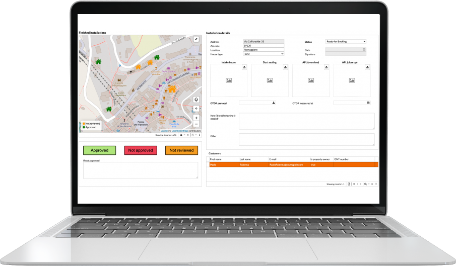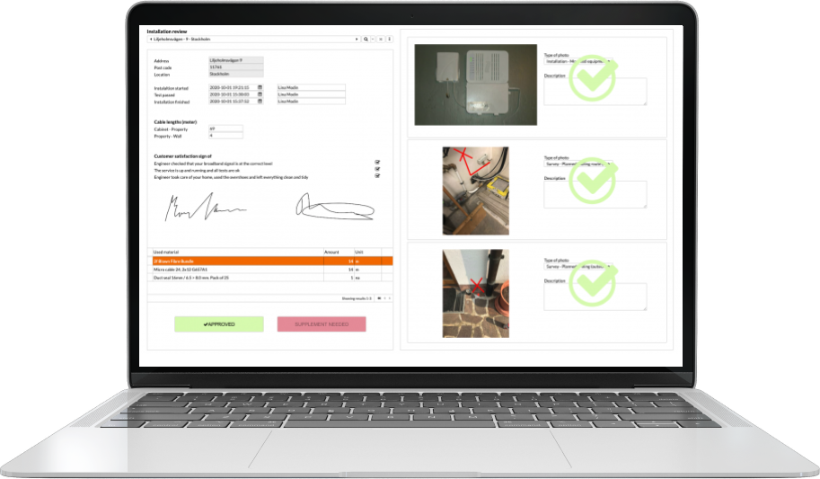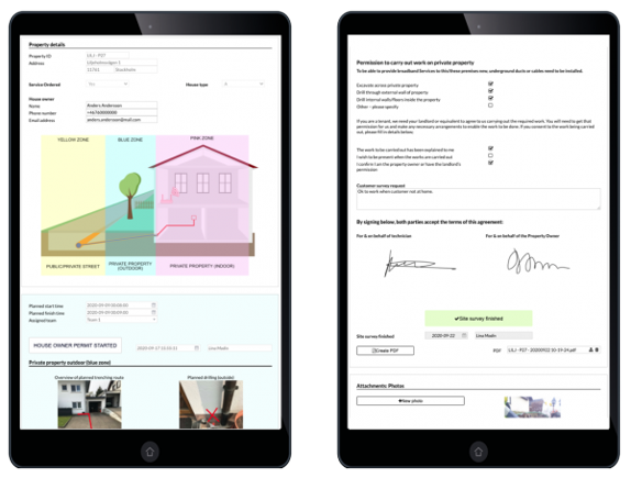 Using field team tablets, installation details are recorded alongside consumers. This includes notes, checklists, annotated images, and used materials. Customers approve the protocol on the tablet at the conclusion of the session, and a PDF agreement is created and sent straight to their email.