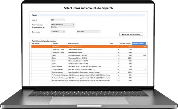 Integrate warehouse management into your workflow so that teams may place material orders based on warehouse stock values. These orders can then be picked up and delivered to the site or allocated to field technician trucks.
